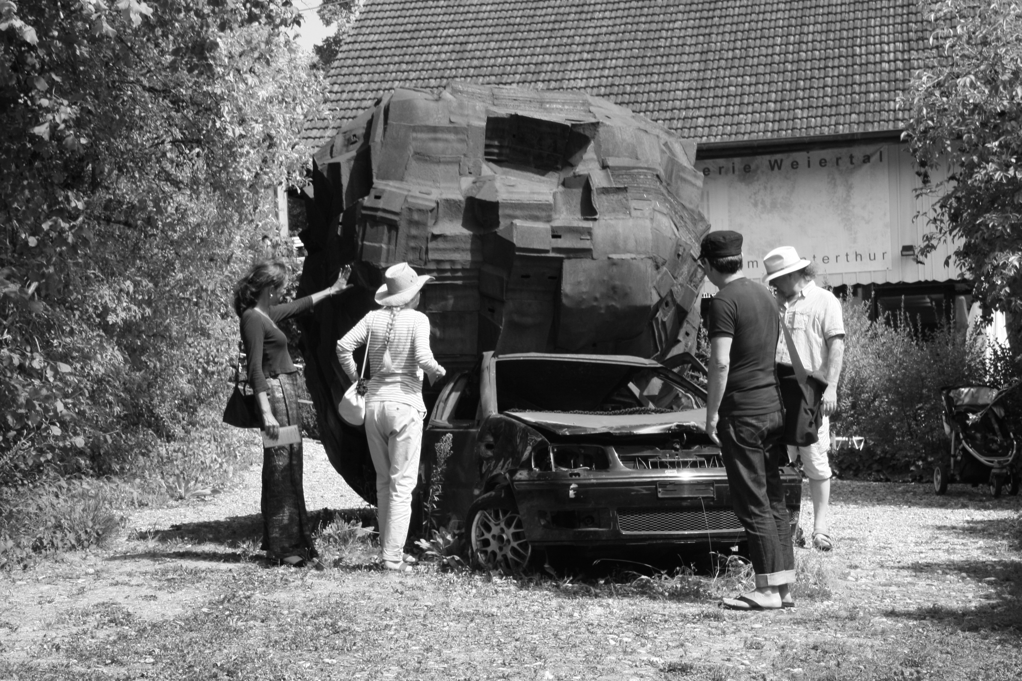„Dinge von denen wir nicht wissen ob es sie auch gibt“, „Dinge die unser Leben verändern“; „Dinge die uns verfolgen“; Dinge, hinter denen sich Gedanken, Geschichten, Vermutungen verbergen; Dinge, die dem Alltag entstammen oder so weit von ihm entfernt sind, dass sie einem Traum entsprungen scheinen, einem „Sommertagtraum“ vielleicht. Er steht als Motto über der diesjährigen Skulpturen-Biennale Weiertal. Nur schon der Idylle des Weiertales mutet in diesen heissen Sommertagen etwas Träumerisches an. Wenige Kilometer entfernt von Häuserzeilen, Strassenverkehr und Stadtrummel plätschert der Rumstaler Steinbach durch eine Streuobstwiese, umgeben von kleinen Waldstücken, Feldern, alten Gehöften. Eines davon nutzt der Kulturort Galerie Weiertal für seine alle zwei Jahre stattfindende Skulpturen-Ausstellung. Der Skulpturbegriff ist weit gefasst, genauso wie das Leitthema.
