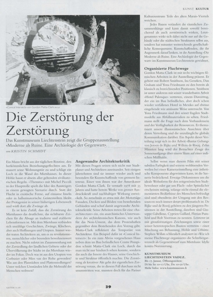 Mit diesen Fragen setzen sich nicht nur Stadtplaner und Architekten auseinander. Seit einigen Jahrzehnten sind sie immer wieder auch und besonders für Künstler von grossem Interesse. Einer von ihnen war der Amerikaner Gordon Matta-Clark. Er verstarb 1978 mit nur 35 Jahren und hatte bereits Werke von grosser Ausdruckskraft und nachhaltiger Wirkung entwickelt. So zerschnitt er etwa mit der Motorsäge Fassaden, Decken und Böden von bestehenden Gebäuden und schuf damit angewandte Architekturkritik: Seine Arbeiten treten für eine Anarchitecture ein, ein anarchistisches Unterwandern des architektonischen Kanons, wie auch für das Non-Ument, das dem Prozesshaften den Vorzug gibt gegenüber dem Bestehenden. Matta-Clark reflektiert das Temporäre von Architektur. Ein Beispiel dafür ist «Conical Intersect»: In ein zum Abriss vorgesehenes Haus neben dem im Bau befindlichen Centre Pompidou schnitt Matta-Clark ein Loch, durch das man nicht nur hindurch sehen konnte, sondern das auch das Innere des Hauses, seine Geschichte und Struktur öffentlich machte. Die Zerstörung als kreativer Akt geht der eigentlichen Zerstörung voraus, die in diesem Fall durchaus nicht unumstritten war, mussten doch für das Pariser Kulturzentrum Teile des alten Marais-Viertels weichen.